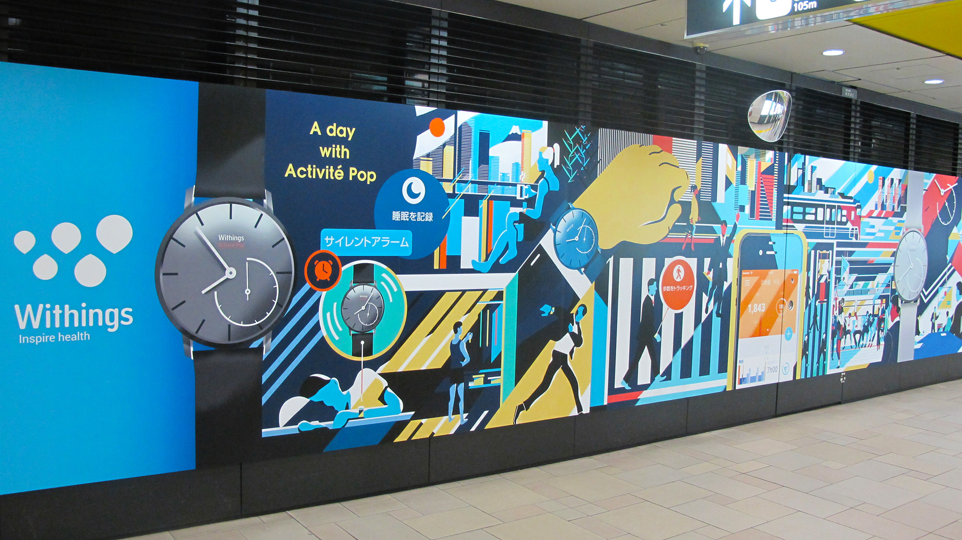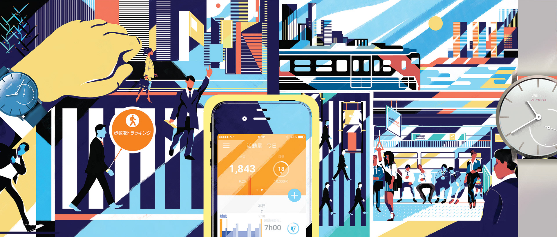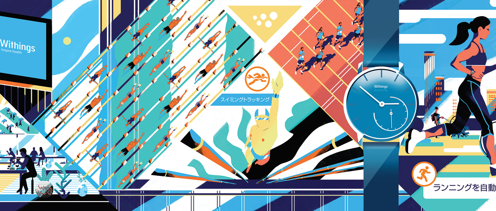 I created this illustration for the smart-watch brand Withings. It was then printed and displayed on a 1.8 meter-high and 27.5 meter-long wall in Omotesando station, in Tokyo.